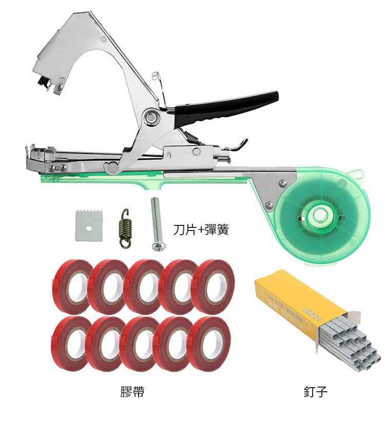 半小時前綁枝好幫手,綑綁省時省力 ?超高效率,只需2秒即完成綁枝 ?適用於番茄、黃瓜、葡萄、豆子、茄子等莖蔓類植物綑綁 - 【黑金剛綁枝機】+刀片+彈簧+40卷加厚膠帶+2盒釘(3萬枚 )